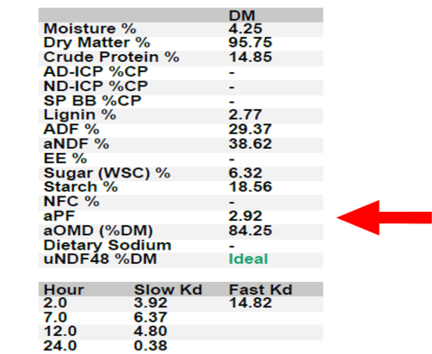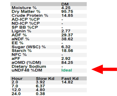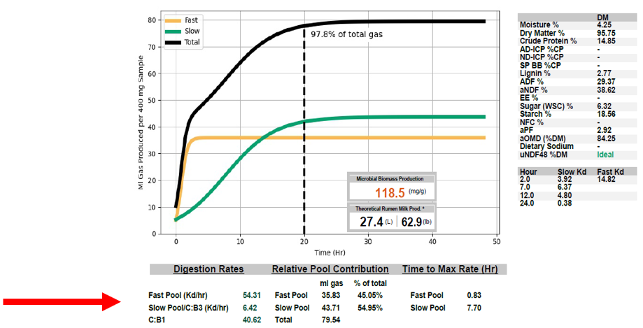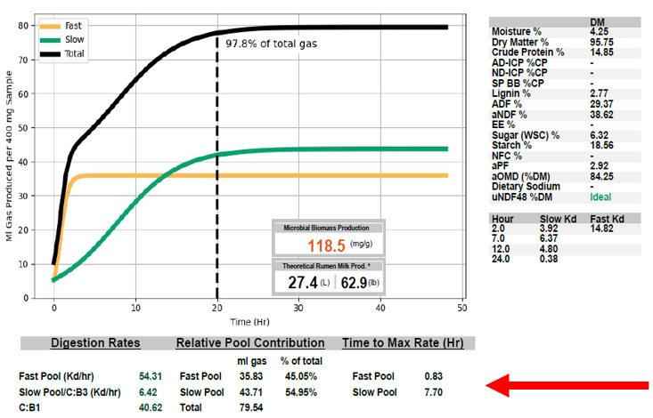 A wide difference may indicate the need for a more intermediate source of energy, such as dry corn (to slow the fast pool Kd) or more corn silage and/or higher quality alfalfa/grass (to increase the slow pool Kd).