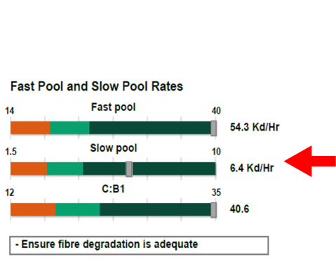 The slow pool rate (Kd) is derived from the maximum rate of degradation per hour of the more slowly degraded B3 (NDF) fibre pool (hemicellulose, cellulose) and due to its heterogeneous nature, may also include slowly degraded starch.