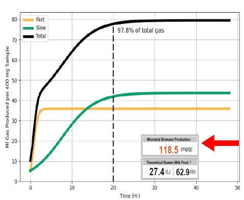 Microbial Biomass Production (MBP) is a measure of the increase in microbial biomass over 48 hours of fermentation. Higher MBP values are associated with higher milk production.