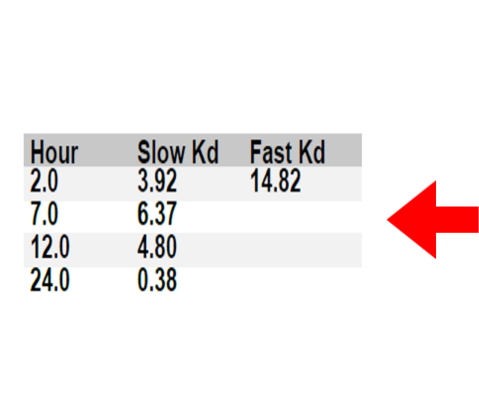 The table shows changes in digestion rate (Kd) over time, driven by changes in fermentation substrate (i.e. the creation of intermediate compounds). As an example, two ingredients could show the same digestion rate at 6 hours but one could remain at this rate for several hours whilst the other reduces immediately after 6 hours. The two ingredients are then biologically different, despite perhaps having the same name and similar digestion rate at a set time point. They should therefore be considered differently in ration modelling: the table can be used to identify the optimal time point digestion rate to use as the basis of a diet formulation.