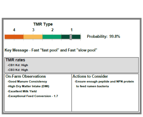Type probabilities show the expected dominant fermentation type. This is based on the digestion rate estimation, using machine learning models (AI). It is possible for more than one probability to be reported, given that there are similarities between the different TMR types, but the AI models report the type with the highest likelihood.
