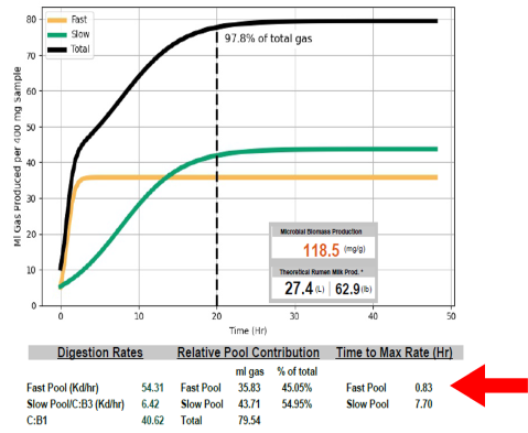 The difference between the time lags to reach maximum degradation rate for the fast and slow pools indicates digestive synchrony. Field experience suggests that when the difference between “time to max” for the fast and slow pools exceeds 10 hours, lowered milk production and/or milk components can result.